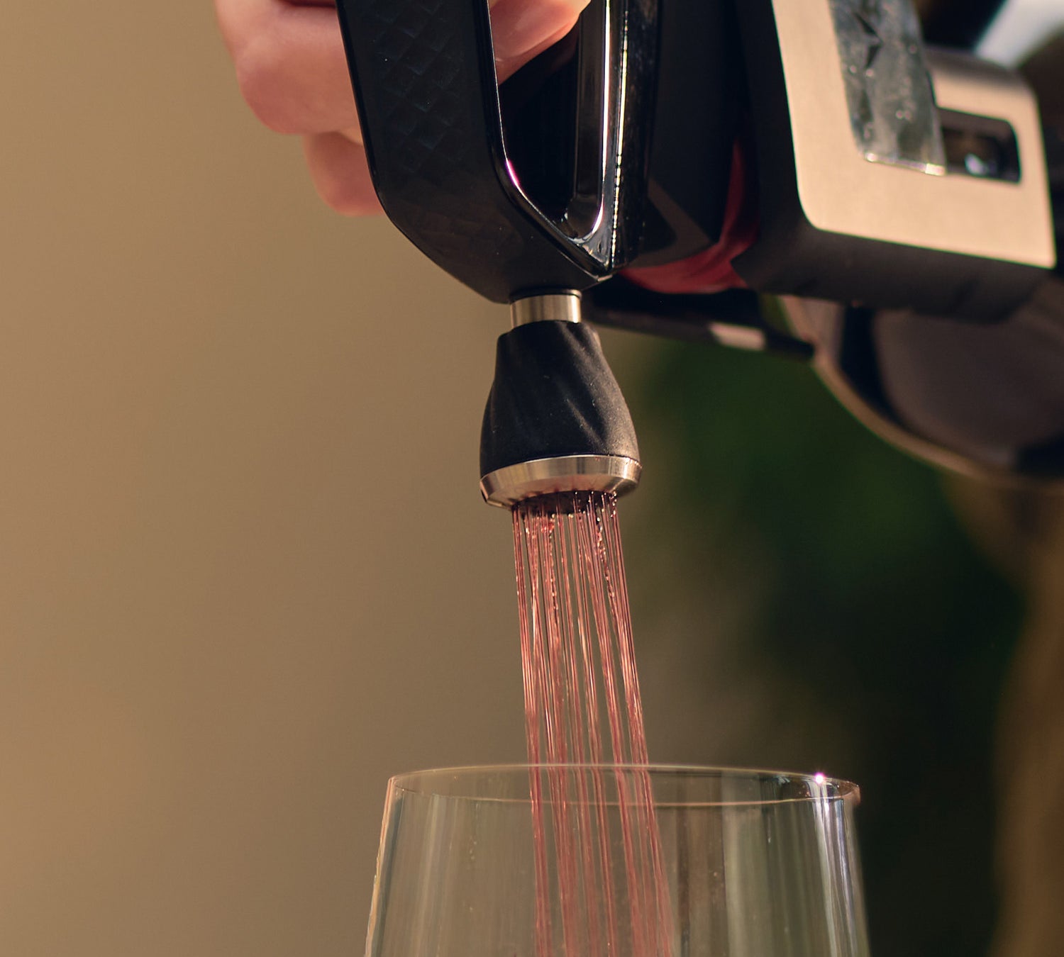 CP: Coravin Timeless systems have a small, hollow needle that pierces through the cork. From there, you tilt the bottle to a 45° angle over a glass and quickly press and release the trigger to pour. Pure argon gas is injected into the bottle to replace the lost wine and preserve what’s left. After you remove the device from the bottle, a natural cork reseals itself so you store the bottle back on its shelf. If you’re hoping to drink a bottle with a synthetic cork or twist-off top, you can use the Coravin screw caps to preserve these bottles.