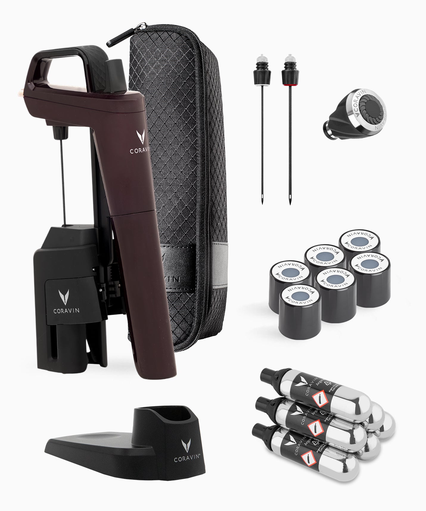 Coravin wine preservation system with black opener, carrying case, gas capsules, and pour spout.